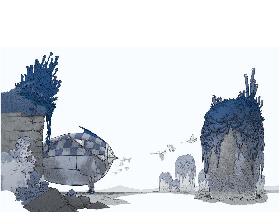Утреннее солнце поднялось над восточной линией горизонта и подсветило медленно плывущие над древними руинами облака. Зиа пробралась сквозь замысловатый лабиринт обвалившихся кирпичных стен и ржавых стальных балок и остановилась перед одиноко стоящей колонной, покрытой гигантским лишайником. Девочка вытащила из сумки пустую бутылку, открутила крышку, содрала с колонны здоровенный морщинистый лист и принялась скручивать его. Зиа выжимала лист, как тряпку, все крепче и крепче, пока из черешка не начала сочиться вода.