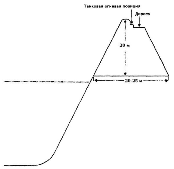 Израильский песчаный вал на восточном берегу канала, состояние на 6 октября 1973 года. Песчаный вал шириной 20–25 м. у основания и около 20 м. высотой Дорога на вершине вала, которая позволяет танкам передвигаться и маневрировать, оставаясь незамеченными с нашей стороны. Вдоль этой дороги оборудованы огневые позиции для танков, по 10 на одном километре
