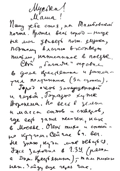 Пишу тебе стоя, на тамбовской почте. Прошел весь город – нигде не мог увидеть почт[ового] ящика, поэтому влагаю в конверт письмо, написанное в поезде[124].