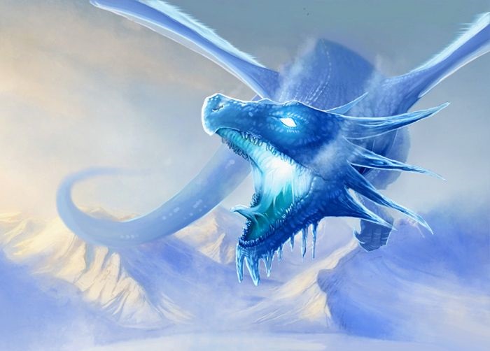 Дракон был поистине прекрасен. Его длинное, гибкое тело, снабженное двумя огромными кожистыми крыльями, и двумя крупными, но изящными когтистыми лапами, было иссини-белого цвета, каким отливает порою снег в глубоких расщелинах зимой. На узкой морде виднелись шипы и наросты, глаза горели каким-то сверхъестественным голубоватым огнем. Зубы в распахнутой пасти сверкали, подобно ледяным сосулькам, и такие же сосульки имелись на подбородке чудовища, свисая вниз опасными остриями.