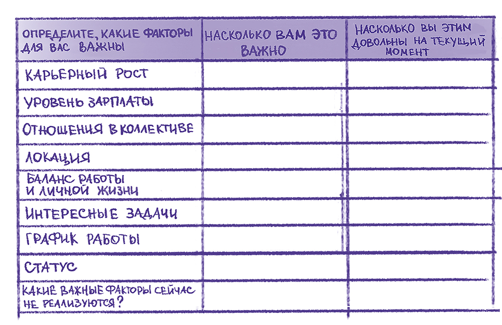 Заполните таблицу. Во втором столбце «Насколько вам это важно» можете использовать обозначения от 1 до 3, где 1 очень важно, а 3 – совсем неважно. А в третьем столбце используйте 10-балльную шкалу, где 10 максимальное значение (полностью доволен), а 1 – совершенно недоволен.