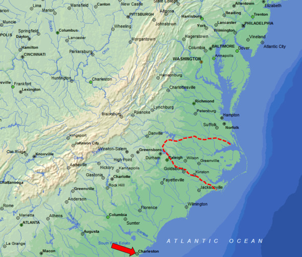 Территория племен народа тускарора до колонизации Америки европейцами (обведена красной пунктирной линией). Чарльстон – красная стрелка.