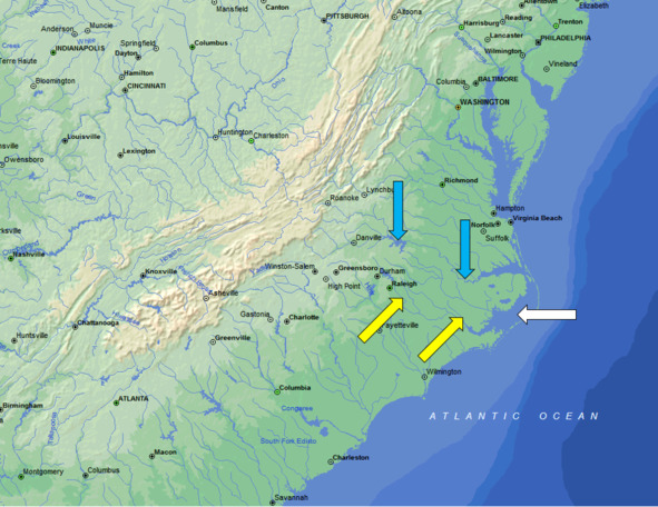 Река Роанок (голубые стрелки), река Нойз (желтые стрелки), залив Памлико (белая стрелка)