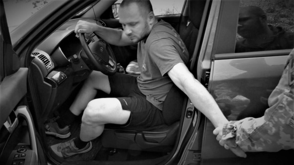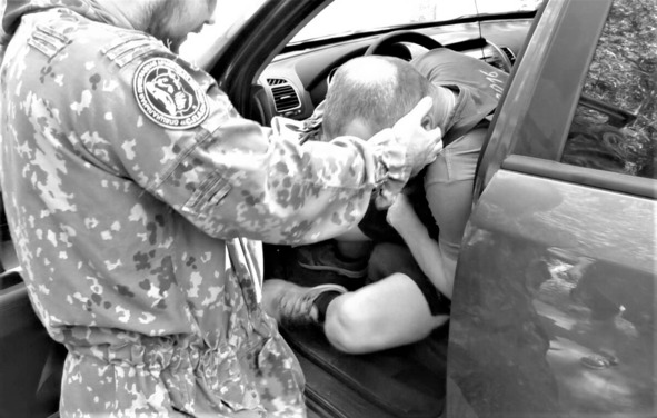 – Удар рукой, захват, и все остальные действия без оружия со стороны агрессора натыкаются на наличие коробки передач и ограниченное пространство, поэтому при движении газуем, крутим машину, резко тормозим, снова газуем, у вас руки на руле, а агрессора будет болтать. Выигрываем паузу, останавливаемся. Далее действуем по схеме: защита головы/шеи, отстегиваем ремень и уходим из авто. Если противник делает захват, то работаем по принципу поршня, на него, от него, бьем, отталкиваемся, приближаемся с ударами и отталкиваемся, в общем, реверс и выход при созданной паузе.