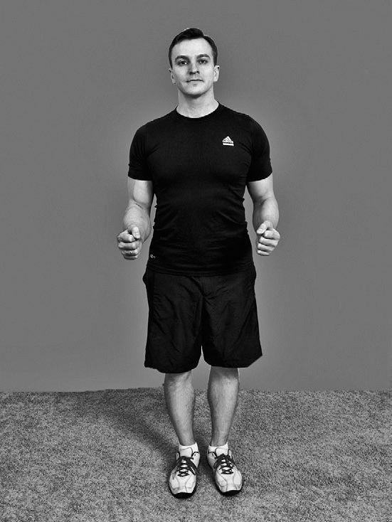 Согните тестируемую руку в локтевом суставе до прямого угла, кисть сожмите в кулак. Прижмите локоть к туловищу. Удерживая локоть на туловище, отводите кулак наружу. В этот момент происходит вращение плечевой кости в плечевом суставе. В норме вы сможете отвести кулак до 45°. Если объем движения значительно меньше – имеется патология плечевого сустава.