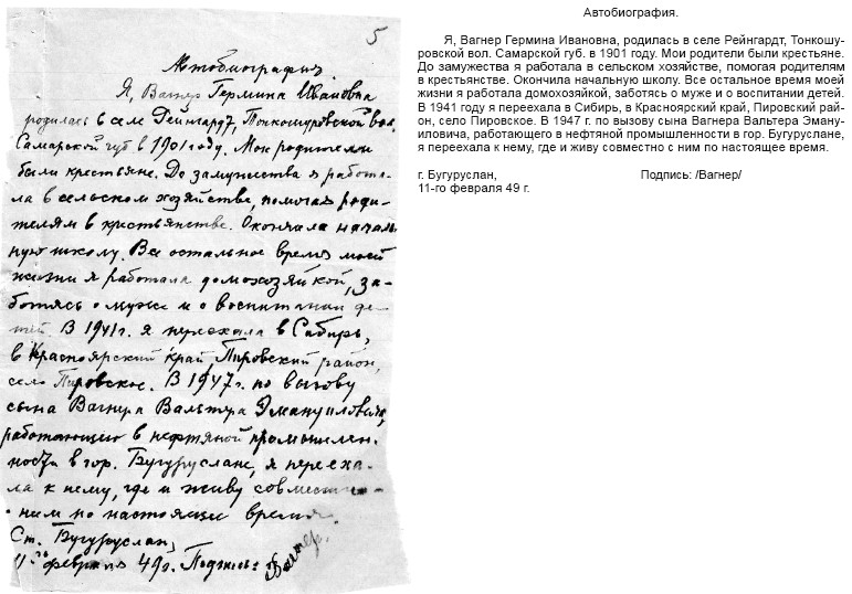 Через полтора месяца мне пришел ответ: в архиве Оренбургского УМВД есть сведения о пребывании на спецпоселении Вагнеров Эмануила, Термины, а также сыновей, Эдмунда и Вальтера. Чтобы получить эти сведения, мне необходимо выслать нотариально заверенные копии документов. Дело в том, что, когда я делаю первый запрос и не уверен в его результатах, я обычно прикладываю простые ксерокопии документов: посылать в каждом письме по несколько нотариальных копий слишком разорительно. Естественно, заверенные копии тут же были отправлены, и скоро я получил ответ: подробную архивную справку, анкеты, четыре фотографии и по две автобиографии каждого из членов семьи. Их Вагнеры писали в 1949 и 1952 годах – видимо, при какой-то перепроверке данных.