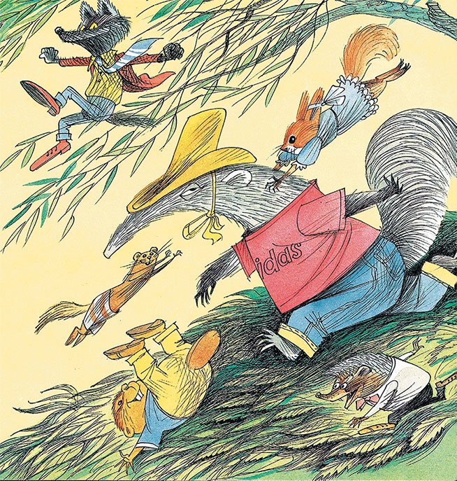 Скоро все попадали. Остался на ногах один большой муравьед. Он ходил, весь обвешанный мелкотой, и пошатывался. Но держался. Вдруг белоснежный горностай прямо с земли сделал прыжок. И свалился ему на голову. Прыжок был такой, что часть горностая была ещё видна на поляне, на траве, а часть уже подлетала к муравьеду. Муравьед рухнул. И все радостно завопили: