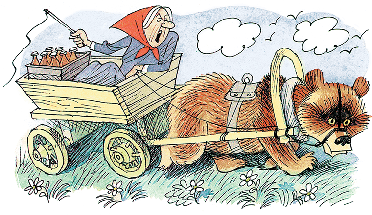 – …У моей бабушки в деревне ручной медведь живёт. Она его в телегу запрягает. Он её возит. И квас в сельпо доставляет. А сейчас зима. Он под бабушкиной кроватью спит. Весной его разбудят. Со всего района будильники соберут. Поедете к нам в деревню, сами увидите.
