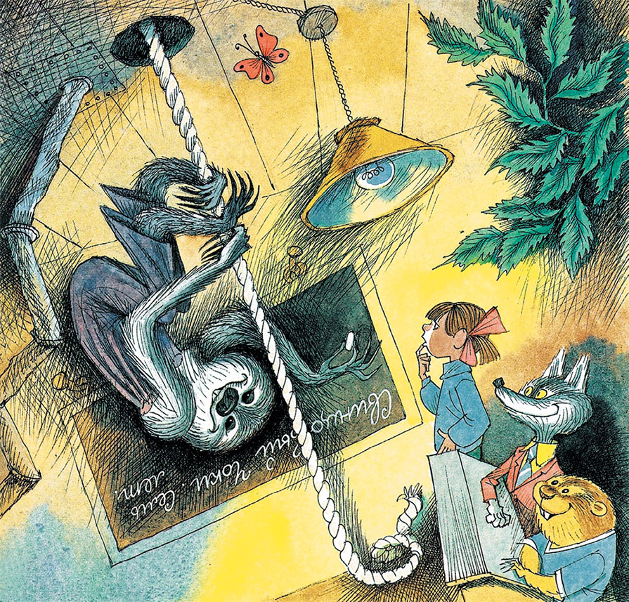 – Он в дыре сидит! Вон! Вон! – повскакала с мест учащаяся мелочь. Они показывали на круглую дыру в потолке. Оттуда к доске тянулся канат.
