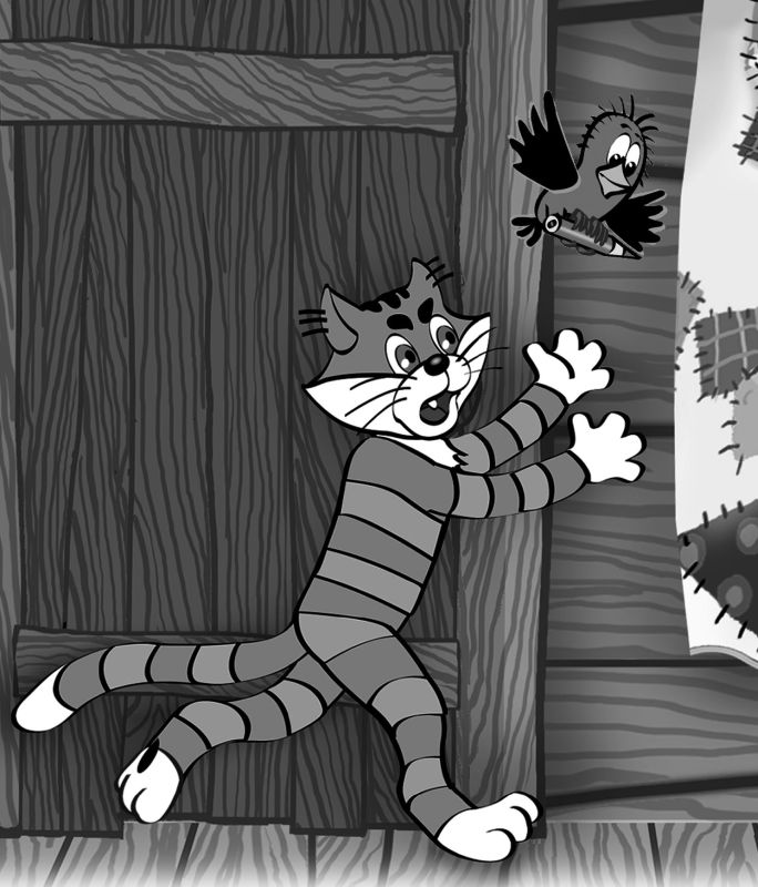 Только отнять у Хватайки что-нибудь не так-то просто было. Полчаса за ним кот по дому гонялся. Наконец отнял карандаш. Хватайка на это обиделся. И только Матроскин отвернётся, он подскочит сзади – и хвать его за хвост! Кот от неожиданности каждый раз до потолка подпрыгивал. А дядя Фёдор смеялся до слёз.