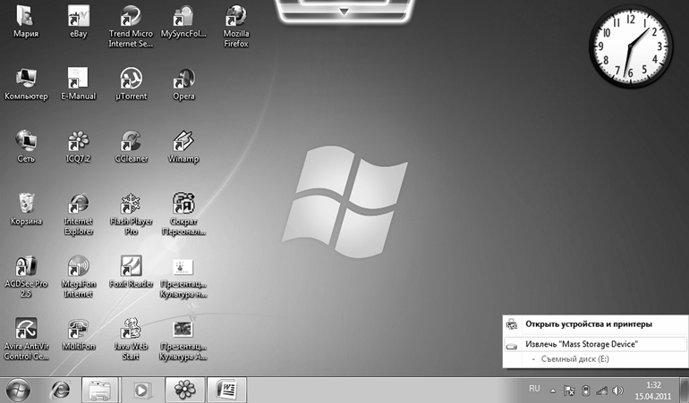 1. Внизу экрана щелкаем левой кнопкой мыши на зеленую галочку – безопасное извлечение устройств и дисков.