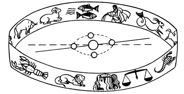 В основе слова «зодиак» лежат греческие слова «животное» и «круг». Таким образом, его буквальный перевод означает «круг животных». И действительно, 11 зодиакальных созвездий из 12 (исключение составляют Весы) носят названия живых существ: Овен, Телец, Близнецы, Рак, Лев, Дева, Скорпион, Стрелец, Козерог, Водолей, Рыбы. На фоне именно этих созвездий происходит видимое перемещение Солнца, Луны и планет. Поэтому разные народы связывали зодиак с образом «небесной дороги».