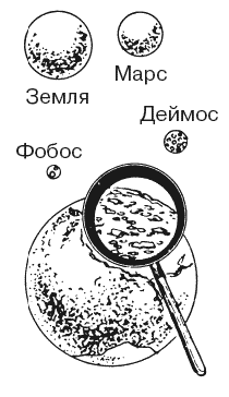 В телескоп на Марсе можно разглядеть тёмные и светлые участки поверхности, а на полюсах – яркие белые пятна: это полярные снеговые шапки. Иногда на этой планете удаётся увидеть «синие облака». Более мелкие детали поверхности Марса удалось рассмотреть по снимкам, сделанным автоматическими межпланетными станциями. Марс выглядит как безжизненная пустыня, покрытая красноватым песком. На Марсе есть многочисленные кратеры метеоритного происхождения, сильно сглаженные ветрами. Есть горы, некоторые из них являются потухшими вулканами. На Марсе находится самая высокая гора в Солнечной системе – это гора Олимп высотой 27 километров, втрое выше нашего земного Эвереста.