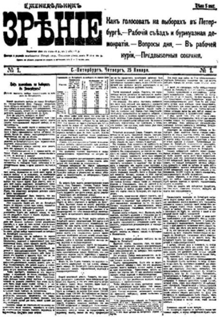 Первая страница газеты «Зрение» № 1, 25 января 1907 г. с передовой статьей В. И. Ленина «Как голосовать на выборах в Петербурге?» (Уменьшено)