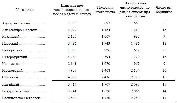 Чтобы убедиться в этом, достаточно посмотреть на приведенные выше цифры. Они показывают, что, имея в каждом участке на один голос больше половины кадетских голосов (на прошлых выборах), можно победить во всем Петербурге.