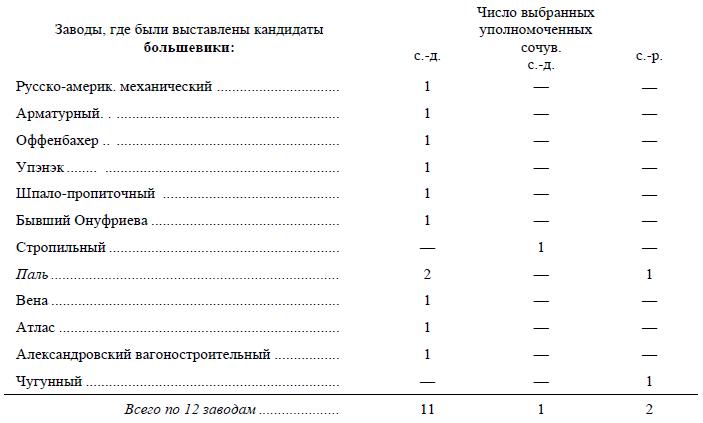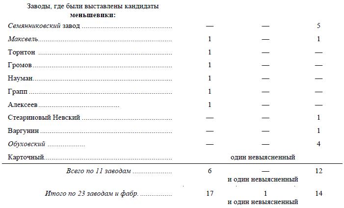 Приводим эти цифры по каждому заводу или фабрике отдельно, чтобы всякий знающий работник мог проверить и исправить наши данные, причем делим заводы на такие, где кандидатами были большевики, и такие, где кандидатами были меньшевики. Заводы безусловно крупные, т. е. давшие более одного уполномоченного, набраны курсивом: