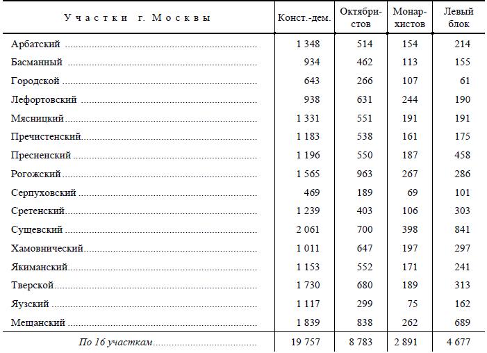 Для сравнения приводим также данные о выборах за 1906 г. в городе Москве из газеты «Наша Жизнь» от 28 марта 1906 г.