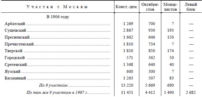 В 1907 г. по тем же участкам было подано голосов против черных 14 133 (в том числе 11 451 за к.-д. и 2682 за левых), а за черных 5902 (в том числе 4412 за октябристов и 1490 за монархистов).