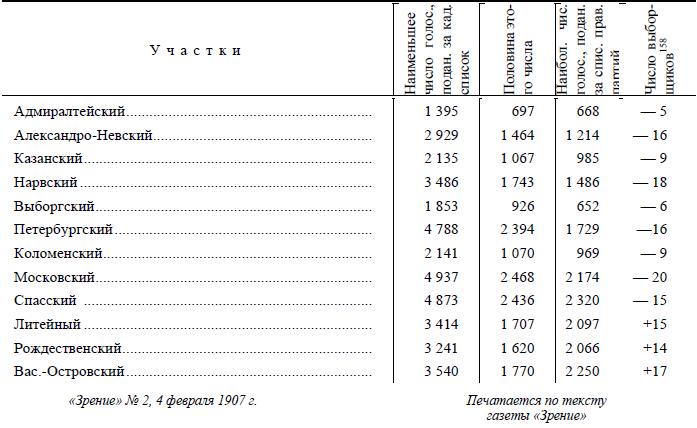 Нельзя вести выдержанной с.-д. работы в С.-Петербурге, если не следить со всем вниманием за ходом голосования рабочих масс за кандидатов той или иной партии. Буржуазным партиям важно только заполучить столько-то мандатов. Нам важно добиться уяснения самими массами учения и тактики социал-демократии в отличие от всех мелкобуржуазных, хотя бы и называющих себя революционными, социалистическими, партий. Мы обязаны поэтому добиться точных и полных данных о голосованиях и выборах в СПБ. по рабочей курии.