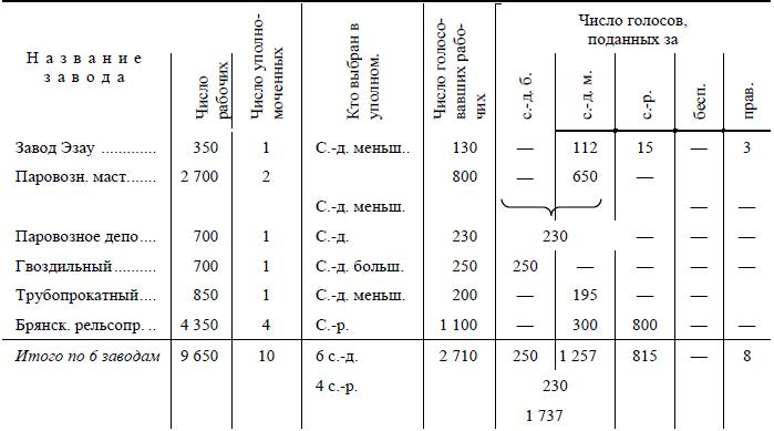Из провинции нам доставлены сведения по шести заводам Екатеринославской губернии. Приводим эти сведения в форме таблички, чтобы показать товарищам, какие данные интересуют партию и какие выводы должны мы делать из опыта первых партийных выборов по рабочей курии.