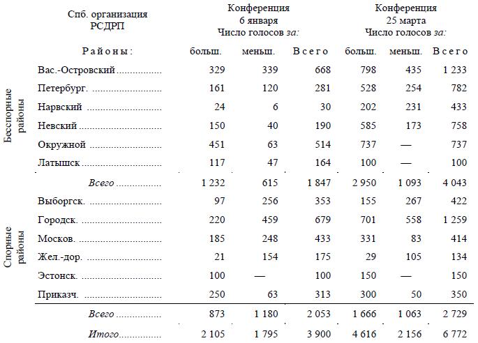 Нам нет надобности здесь воспроизводить все эти детальные разделения. В примечании мы оговорим особо все исправления, вносимые меньшевиками. Для сравнения же возьмем итоги «числа голосовавших» за большевиков и за меньшевиков, т. е. сложим бесспорные и спорные голоса вместе, чтобы путем сравнения этих данных с данными о голосах при выборах на конференцию 25-го марта всякий член партии мог сам убедиться в том, какие неправильности и с чьей стороны имели место при выборах на конференцию 6-го января.