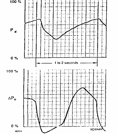 При уменьшении давления в системе производительность компрессора становится меньше, чем требуется в системе при новом давлении (V'A Так как расход системы V'B больше производительности компрессора (V'B>VB), давление в системе должно уменьшаться. Однако, незначительное уменьшение давления в системе приводит к переходу компрессора из режима в точке В в режим в точке С. Так как производительность компрессора становится больше требуемой для системы (VС> V'B), давление в системе растет, пока режим работы компрессора не достигнет точки К, а в системе точки К'. При незначительном увеличении давления в системе режим работы компрессора из точки К переместится в точку Е. Так как производительность компрессора в точке Е меньше требуемой в системе точки К' (VB В результате в системе – "компрессор – трубопровод" возникнут автоколебания газа, сопровождаемые внезапными изменениями производительности и давления нагнетания компрессора. Такое явление известно под названием "помпаж" компрессора, рис. 1.7. Рис. 1.7. Развитие помпажа во времени Говоря проще, скорость движения газа меняет свое направление на противоположное. При этом на противоположную меняется и аэродинамическая сила. Можно просто представить порядок величин аэродинамических сил, поскольку их момент относительно оси ротора требует для вращения последнего эффективной мощности приводного двигателя. При изменении таких больших сил и момента на противоположные механические нагрузки на вал, подшипники, диафрагмы и корпус компрессора в целом превышают допустимые величины. Из-за нелинейности характеристик компрессора его рабочая точка ускоряется, приближаясь к помпажу, независимо от того двигается ли она вдоль характеристики при неизменных оборотах или скорость вращения меняется под влиянием системы автоматического регулирования (САР). Чтобы уменьшить расстояние между границей помпажа и линией настройки, САР должна учитывать влияние этого ускорения. Способность антипомпажного клапана обеспечивать быстрый выпуск газа является одной из его важнейших характеристик. Практика эксплуатации знает случаи, когда даже непродолжительная работа на режиме помпажа приводила к разрушению компрессора. Из-за высокой частоты возникающих автоколебаний в диапазоне 05-2Гц, развитие помпажа происходит очень быстро. Чаще всего на устранение помпажа есть не более 2-3 сек, после чего происходят необратимые повреждения компрессора. Помпаж является следствием неконтролируемого развития квазистационарных процессов в центробежном компрессоре, когда достаточно стабильное течение потока переходит в фазу вращающегося срыва и далее в помпаж. Так, в области квазистационарного течения разбросы давления и расхода (дисперсия потока по этим параметрам) слабо зависят от расхода и числа оборотов. Переходные процессы в условиях наброса и сброса нагрузки практически не влияют на дисперсию, незначительно увеличивая последнюю. В области вращающегося срыва дисперсия возрастает в среднем в 2-2,5 раза. При помпаже наблюдается ее активный рост в 20 и более раз. Темп роста дисперсии составляет на первой гармонике порядка 150 единиц в секунду. Пульсации перепада давления в области помпажа представляет собой синусоиду. Этот факт говорит о том, что помпаж – это резонансный процесс. Исследования, проведенные в Казанском 