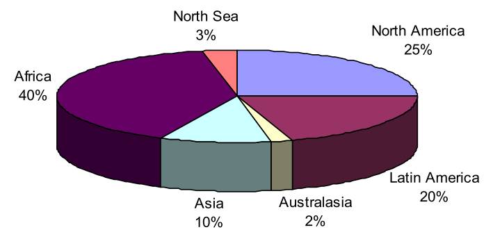 Рис.1. Распределение добычи и обработки нефти и газа на морских месторождениях по странам мира.