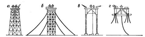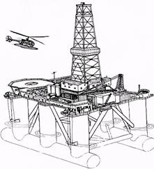 Основания свайного типа применяют при глубине воды до 10 м и при резких изменениях рельефа дна. Под сваи в дне моря со специального судна бурят скважины. В каждую такую скважину спускают сваю-трубу и цементируют ее. Затем трубы обрезают так, чтобы их концы были над водой на одинаковом уровне. Концы труб связывают плоскими металлическими фермами, а на них настилают пол, устанавливают вышку и буровое оборудование. Высота свай над уровнем воды должна превышать высоту самых больших волн.