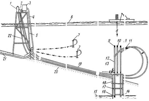 1 – панель дистанционного управления; 2 –манифольд; 3 – замерное эксплуатационное оборудование; 4 – стояк 275мм; 5 – эксплуатационная платформа; 6 – поверхность моря; 7 – скважины; 8 – возможный вертикальный вход в скважину; 9 – насосно-компрессорные трубы; 10 – затрубное пространство; 11 – задвижки; 12 – подводное оборудование устья скважины для компрессорной эксплуатации; 13 –манифольд гидравлической линии для управляющих задвижек; 14 –пробка; 15 – продуктивный интервал; 16 – установочный патрубок; 17 – пакер; 18 – обсадная колонна; 19 – выкидные линии; 20 – дно океана; 21 – заглубленный трубопровод до берега или до центральной платформы; 22 – гидравлические линии для управляющих задвижек