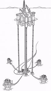 Полупогружную платформу при бурении иногда крепят ко дну натяжными опорами. В этом случае обеспечивается хорошая фиксация платформы над точкой бурения. Одиночные скважины и кусты скважин, закрепленные на донных платах, обвязывают единой системой трубопроводов. Действующая система сбора продукции на морском промысле в Мексиканском заливе показана на рис.1.17.
