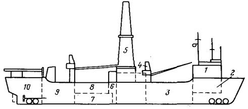 1 – помещение для вычислительных машин; 2 – жилые помещения; 3 – трюмы для труб; 4 – пост бурового мастера; 5 – буровая вышка; 6 –погружная телевизионная система; 7 – помещение для буровых насосов; 8 – трюмы для хранения материалов и приготовления бурового раствора; 9 – машинное отделение; 10 – приводные механизмы