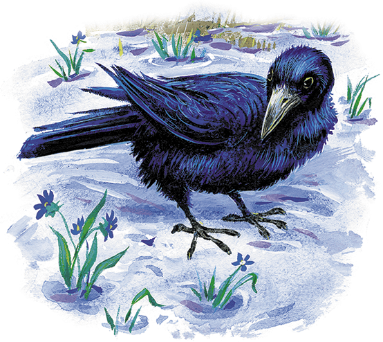 Грачи – это наши первые весенние гости. Только пригреет солнышко, зажурчат ручейки, запестреют в полях проталины, смотришь – и грачи уже прилетели из тёплых стран. Вот они, чёрные как угли, разгуливают по проталинам, копошатся в оттаявшей земле: то зёрнышко найдут, то корешок откопают. Ранней весной нашим гостям не очень-то сытно живётся.