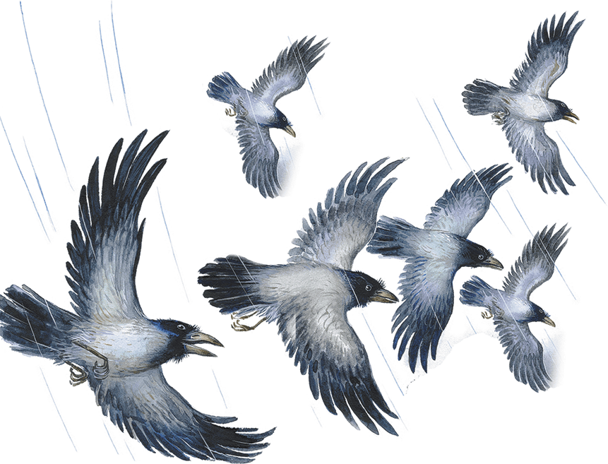 Так всю зиму и пробавляются вороны: там корочку схватят, там – мяса кусочек. Живут они в эту пору и в городах и в деревнях. Зимой возле жилья человека легче прокормиться.