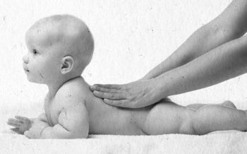 – Исходное положение (далее и. п.) – ребенок лежит сначала на спинке, а затем на животике. Родители нежно поглаживают ребенка по груди, животику, спинке, ягодичкам и конечностям.