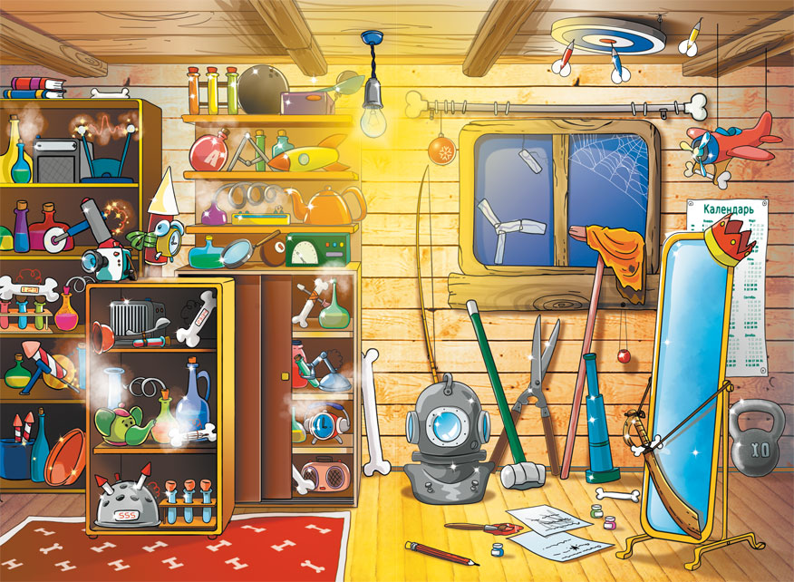 Стены прогнили и покосились от ветра. Разбитое окно залеплено скотчем. Снаружи жилище выглядело не очень уютным. А внутри оно было ещё страннее. Всю его левую половину занимали стеллажи с непонятными железными, стеклянными и деревянными приборами. Они шипели, гудели и вращали маятниками. Каждую минуту что-то бурлило, взрывалось или взлетало под потолок. Как ни удивительно, в происходящем наблюдался порядок. Пёс Тюбик всё свободное время посвящал своим изобретениям.