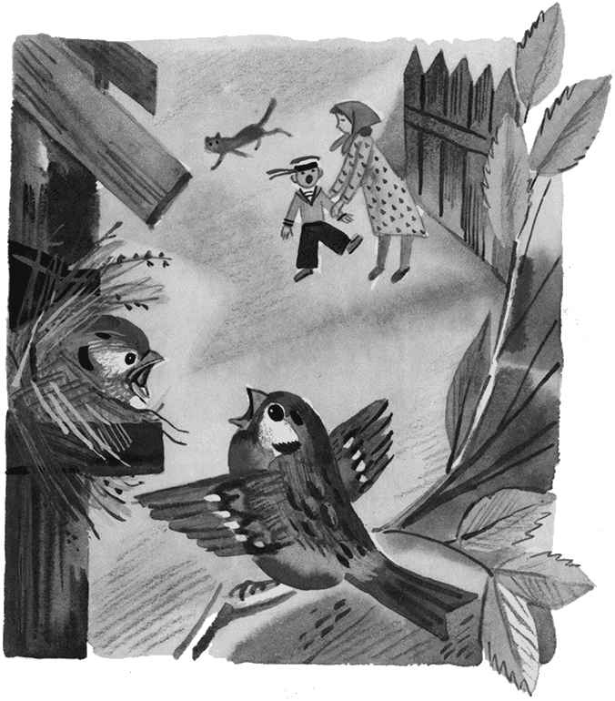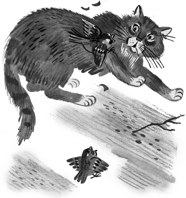А воробьиха отталкивает его в сторону, перья у неё дыбом встали – страшная, храбрая, клюв раскрыла – в глаз кошке целит.
