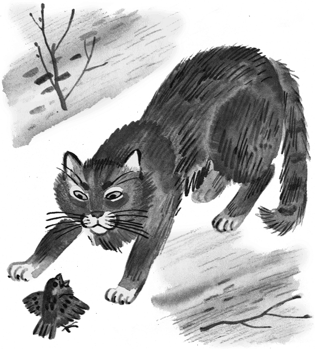 Пел, пел да и вывалился из гнезда, а воробьиха за ним, а кошка – рыжая, зелёные глаза – тут как тут.