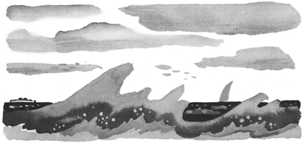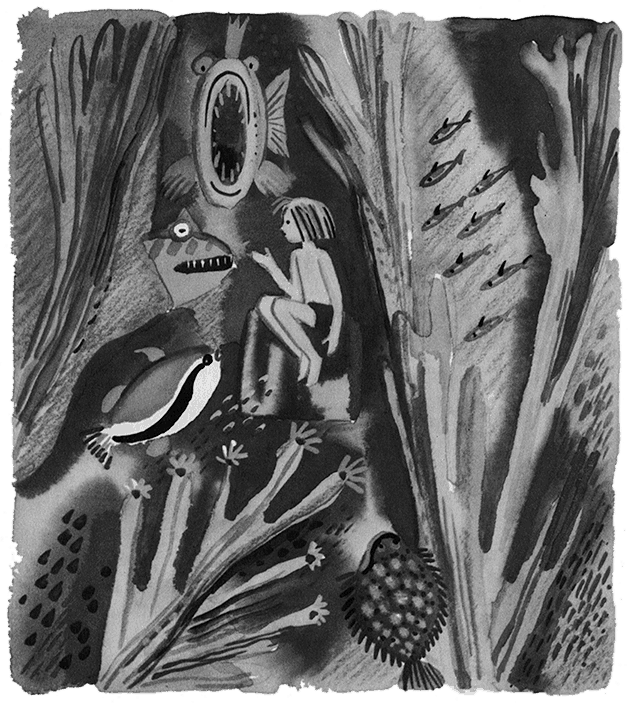Смотрит – над головою у него огромнейшая рыба в сизо-серебряной чешуе, выпучила глаза и, оскалив зубы, приятно улыбается, точно её уже зажарили и она лежит на блюде среди стола.