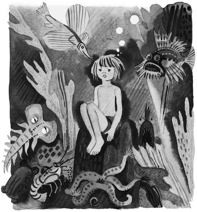 Ползёт не торопясь алая морская звезда, солидно ходят по камням усатые лангусты, боком-боком двигается краб; везде на камнях, точно крупные вишни, рассеяны актинии, и всюду множество всяких любопытных штук: вот цветут-качаются морские лилии, мелькают, точно мухи, быстрые креветки, вот тащится морская черепаха, и над её тяжёлым щитом играют две маленькие зелёные рыбёшки, совсем как бабочки в воздухе, и вот по белым камням везёт свою раковину рак-отшельник. Евсейка, глядя на него, даже стих вспомнил:
