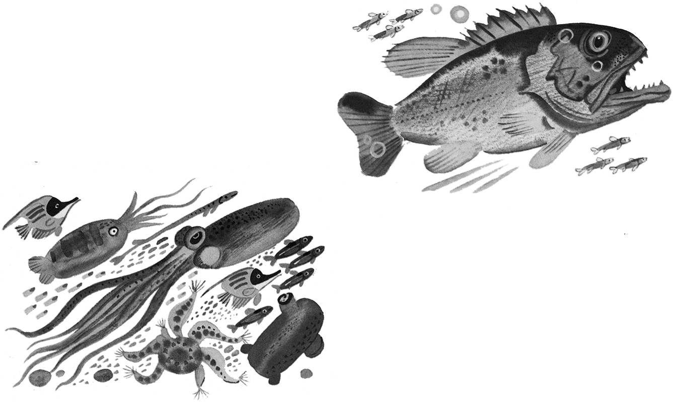 И хочет поймать их, а они, уплывая из-под рук, резвятся, толкают друг друга носами в бока и поют хором, дразня большого рака: