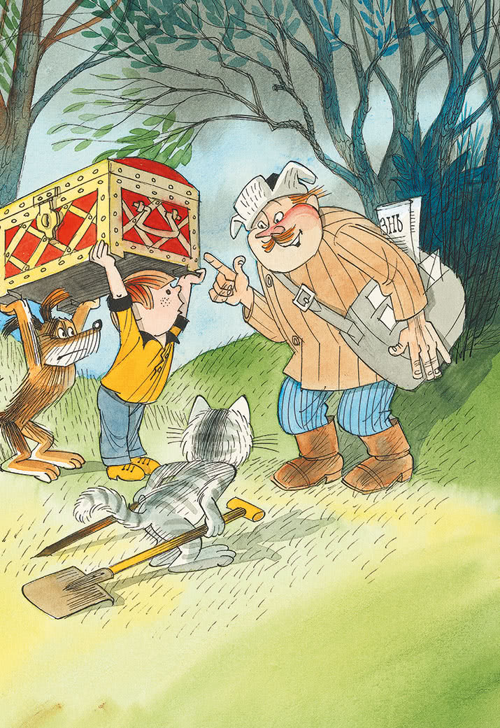 И тут у дяди Фёдора лопата как звякнет обо что-то – а это сундук окованный. А в нём всякие сокровища и монеты старинные. И камни драгоценные. Взяли они этот сундук и домой пошли. А навстречу им почтальон Печкин спешит.