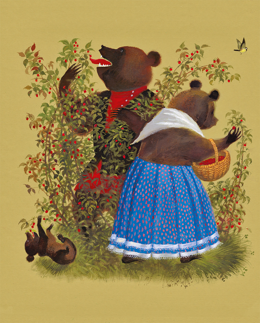 Дверь была отворена; она посмотрела в дверь, видит – в домике никого нет, и вошла. В домике этом жили три медведя. Один медведь был отец, звали его Михаил Иваныч. Он был большой и лохматый. Другой была медведица. Она была поменьше, и звали её Настасья Петровна. Третий был маленький медвежонок, и звали его Мишутка. Медведей не было дома, они ушли гулять по лесу.