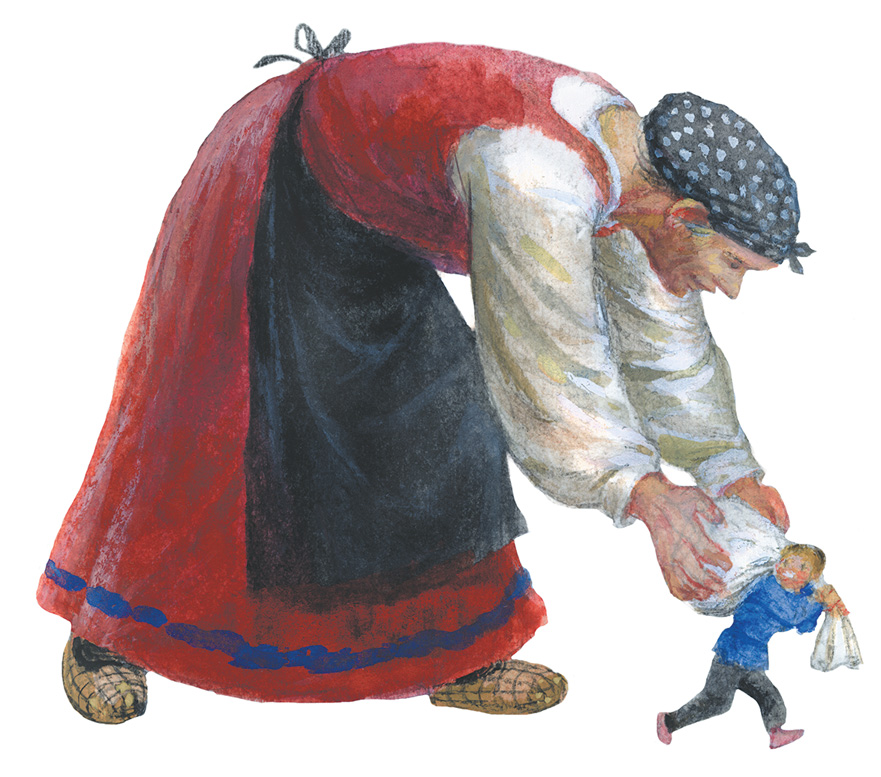 Старуха завязала блины в узелок и дала сыночку. Липунюшка взял узел и побежал в поле.