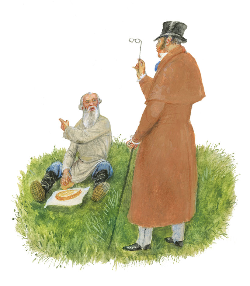 Ехал мимо этого поля барин и увидал, что старик сидит завтракает, а лошадь одна пашет. Барин вышел из кареты и говорит старику: