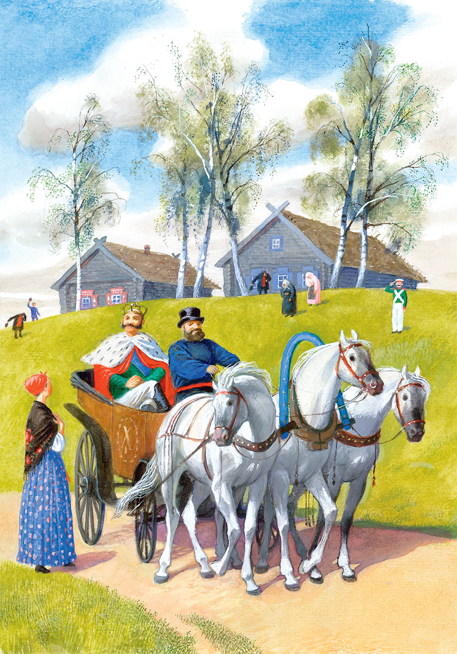 Ехал раз царь за город. Проезжает мимо Емельянова двора, и вышла Емельянова жена посмотреть царя. Увидал её царь, удивился: «Где такая красавица родилась?» Остановил царь коляску, подозвал жену Емельяна, стал её спрашивать: