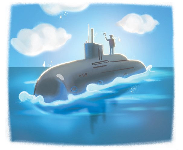 С этими словами он вслед за моряками спустился в подводную лодку и задраил люк. Затем огромный железный блестящий зверь начал медленно опускаться под воду… Вот только тихо, к сожалению, не получилось – пошли такие волны, что лодку, в которой сидели дети, коты и собака, начало подбрасывать вверх, да так высоко, что казалось, можно было потрогать огромное голубое небо и даже задеть солнце.