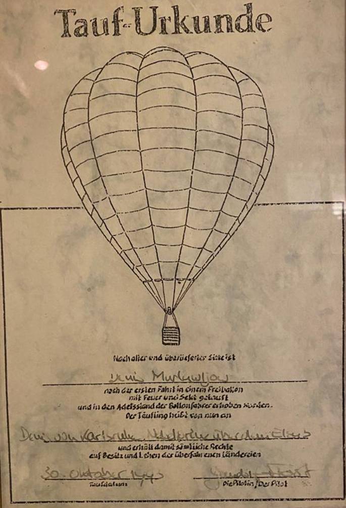 Позитивная убедительность Биркина успокоила национальные опасения полицейских по необходимости отражения атак сверху, и, когда воздушные стражи порядка уехали на своём крошечном «Рено», приятели отправились в местную харчевню, где Биркин был торжественно принят в цех воздухоплавателей, клятвенно приняв многострофную стихотворную присягу «небесного рыцаря», произнесённую им на одном из двух эльзасских наречий. Для этого потребовалось стать преклонённым джинсовым коленом на дощатом полу деревенского заведения, после чего шло в ход традиционное для таких рыцарских посвящений поджигание волос от спички на его буйной русой голове, а далее всё это торжество было в противопожарных целях моментально затушено дорогим брютом как снаружи, так и изнутри.