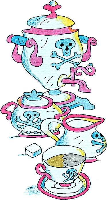 Повсюду висели надписи: «Не трогать – смертельно!» А рядом рисунки с черепом и костями. Даже на шкафу с посудой. На столе стоял электрический самовар с таким же рисунком и фарфоровые чашки с теми же надписями. И только на огромной красной тахте в углу ничего не было написано.