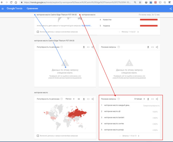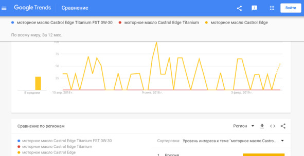 Потому что в trends.google.ru, (см. изображение ниже) синим видно, что нигде и никогда такой запрос не делают. Но видно (жёлтым), что просто «моторное масло Castrol Edge» люди ежедневно набирают по 50—100 раз в месяц.