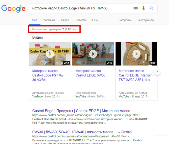 Набираем в Google «моторное масло Castrol Edge Titanium FST 0W-30», и смотрим конкуренцию по этому слову т.е. сколько страниц по этому запросу нашёл поисковик.